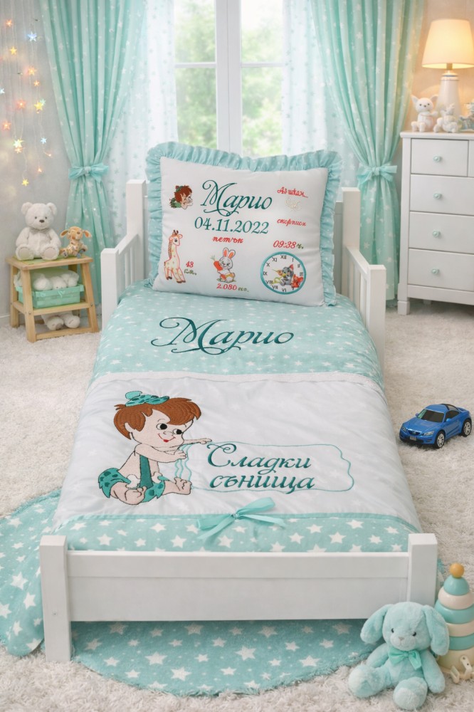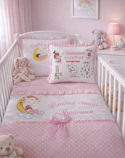 Бебешко спално бельо от Бебешка визитка. Съставено от 100% висококачествен памук спалният комплект ще накара Вашето бебе да се чувства комфортно и да бъде обгърнато от мекота и нежност. Натуралната материя на чистия 100% Памук позволява на Вашето бебе да диша спокойно през цялата нощ.