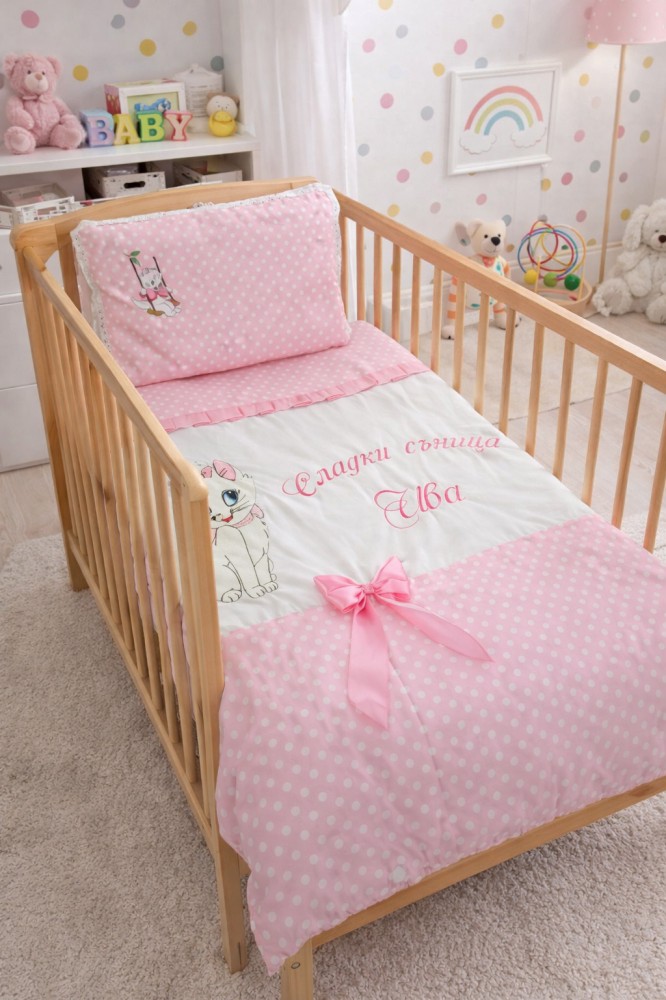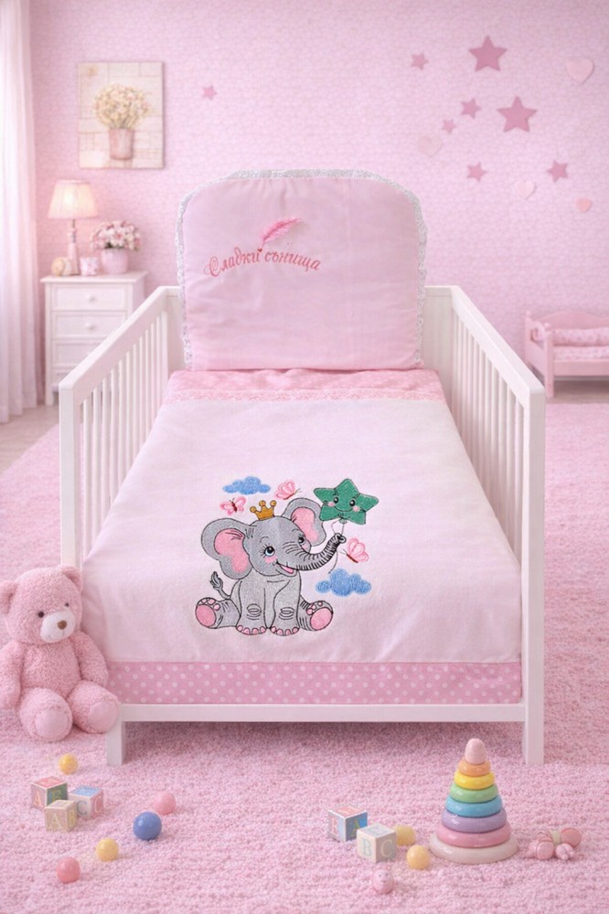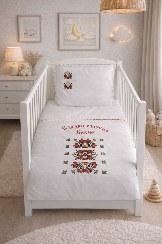 Бебешко спално бельо от Бебешка визитка. Съставено от 100% висококачествен памук спалният комплект ще накара Вашето бебе да се чувства комфортно и да бъде обгърнато от мекота и нежност. Натуралната материя на чистия 100% Памук позволява на Вашето бебе да диша спокойно през цялата нощ.